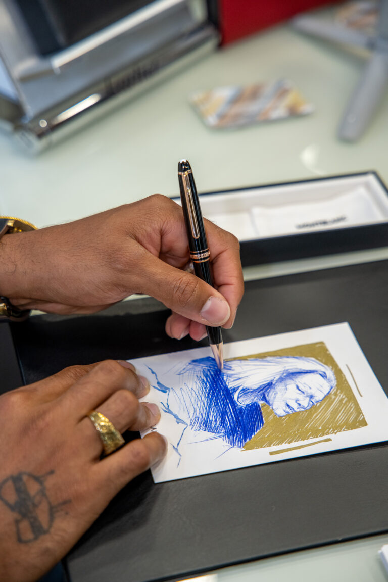 À l’aide du mythique stylo Montblanc Meisterstück, icône absolue de la Maison, l’artiste réalisait des portraits personnalisés à la demande, transformant chaque rencontre en une œuvre unique. Un instant suspendu, où le geste d’écriture devenait un langage artistique, créant un lien direct entre la création, l’objet et celui qui le reçoit.